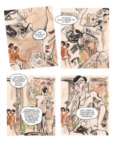 « Deux filles nues » c’est le titre d’une peinture d’Otto Mueller, et la BD s’ouvre avec une scène en 1919, où sa femme Machka pose pour lui et où l’on voit littéralement le tableau se mettre en place sous nos yeux. Cette inventivité va être le fil conducteur de l’ouvrage puisque l’histoire (et l’Histoire) est racontée à travers le point de vue de ce qui se déroule devant le tableau.